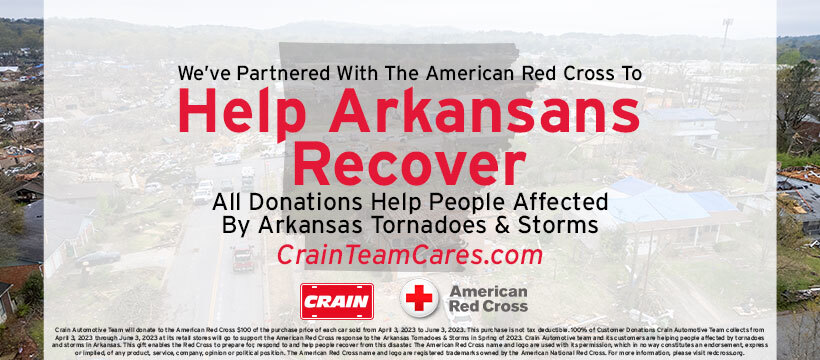 Crain Automotive, RV, Powersports, and Collision Centers would like to extend our thoughts and prayers to all of those impacted by the devastating storms. For years, Arkansans have been here for us, now we would like to be there for you. We have partnered with the American Red Cross to assist in the recovery of our local communities. The Crain Team is dedicated to helping those in our community and across the state. We are Arkansas Driven and community focused.