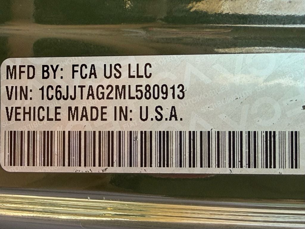 2021 Jeep Gladiator 4WD 3.6L V6 24V VVT 8-Speed Automatic New Tires, New Brakes, Off Road Package, Lift, Wheels and Tires, Gladiator Sport OFF ROAD READY / LIFT WHEELS AND TIRES, 4D Crew Cab, 3.6L V6 24V VVT, 8-Speed Automatic, 4WD, Sarge Green Clearcoat, Black Cloth, 110 mph Vehicle Max Speed Calibration, 240 Amp Alternator, 4-Wheel Disc Brakes, 4.10 Rear Axle Ratio, 7.0 Touch Screen Display, ABS brakes, Air Conditioning w/Auto Temperature Control, Anti-Lock 4-Wheel Disc Heavy Duty Brakes, Anti-Spin Differential Rear Axle, Apple CarPlay, Automatic Headlamps, Black 3-Piece Hard Top, Black Molded-In-Color Fender Flares (2-Piece), Body Color Fender Flares (2-Piece), Brake assist, Class IV Hitch Receiver, Cloth Low-Back Bucket Seats, Cluster 7.0 TFT Color Display, Compass, Convenience Group, Dana M210 Wide Front Axle, Dana M220 Wide Rear Axle, Daytime Running Lamp System, Deep Tint Sunscreen Windows, Delay-off headlights, Dual front impact airbags, Dual front side impact airbags, Electronic Stability Control, For More Info, Call 800-643-2112, Freedom Panel Storage Bag, Front 1-Touch Down Power Windows, Front anti-roll bar, Front fog lights, Google Android Auto, GPS Antenna Input, GVWR: 6,250 lbs w/Max Tow Package, Heavy-Duty Engine Cooling, Integrated Center Stack Radio, Integrated roll-over protection, Integrated Voice Command w/Bluetooth®, Leather Wrapped Steering Wheel, Low tire pressure warning, Max Tow Package w/4.10 Axle Ratio, Molded in Color Bumper w/Accent Color, Normal Duty Plus Suspension, Normal Duty Suspension, Occupant sensing airbag, Outside temperature display, ParkView Rear Back-Up Camera, Passenger vanity mirror, Popular Equipment Package, Power Heated Mirrors, Power Tailgate Lock, Quick Order Package 23S Sport S, Radio: Uconnect 4 w/7 Display, Rear anti-roll bar, Rear reading lights, Rear Sliding Window, Rear Window Defroster, Remote Keyless Entry, Security Alarm, Side Steps, SiriusXM Radio Service, SiriusXM Satellite Radio, Speed control, Speed Sensitive Power Locks, Sport S, Sun Visors w/Illuminated Vanity Mirrors, Tachometer, Technology Group, Telescoping steering wheel, Tilt steering wheel, Traction control, Trailer Hitch Zoom, Trailer Tow Package, Trip computer, Universal Garage Door Opener, USB Host Flip. CARFAX One-Owner. Clean CARFAX.