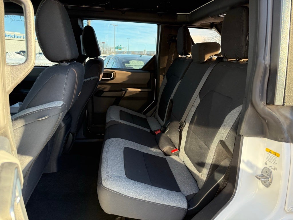 2022 Ford Bronco 4WD 2.3L EcoBoost I-4 10-Speed Automatic 3.73 Axle Ratio, 4-Wheel Disc Brakes, 6 Speakers, ABS brakes, Air Conditioning, AM/FM radio: SiriusXM with 360L, AM/FM Stereo, Auto High-beam Headlights, Brake assist, Cloth Bucket Seats, Compass, Delay-off headlights, Driver door bin, Driver vanity mirror, Dual front impact airbags, Dual front side impact airbags, Electronic Stability Control, Emergency communication system: 911 Assist, Equipment Group 101A Standard Package, Exterior Parking Camera Rear, Front anti-roll bar, Front Bucket Seats, Front Center Armrest, Front reading lights, Front wheel independent suspension, Fully automatic headlights, Heated door mirrors, Illuminated entry, Integrated roll-over protection, Low tire pressure warning, Occupant sensing airbag, Outside temperature display, Overhead airbag, Overhead console, Panic alarm, Passenger door bin, Passenger vanity mirror, Power door mirrors, Power steering, Power windows, Radio data system, Remote keyless entry, Security system, SiriusXM Radio w/360L, Speed control, Split folding rear seat, Steering wheel mounted audio controls, SYNC 4, Tachometer, Telescoping steering wheel, Tilt steering wheel, Traction control, Trip computer, Variably intermittent wipers, Wheels: 16 Bright Polished Silver-Painted Steel. CARFAX One-Owner.