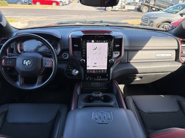 Bluetooth®, Safety Package, 1500 Rebel, 4D Crew Cab, HEMI 5.7L V8 Multi Displacement VVT eTorque, 8-Speed Automatic, 4WD, Diamond Black Crystal Pearlcoat, Red/Black w/Cloth/Vinyl Low Back Bucket Seats or Lux Leather Trimmed Bucket Seats, 12 Touchscreen Display, 2nd Row In Floor Storage Bins, 3.92 Rear Axle Ratio, 4 Way Front Headrests, 4-Wheel Disc Brakes, 48V Belt Starter Generator, 4G LTE Wi-Fi Hot Spot, 6 Speakers, 9 Amplified Speakers w/Subwoofer, ABS brakes, Active Noise Control System, Air Conditioning, AM/FM radio: SiriusXM with 360L, Apple CarPlay, Apple CarPlay/Android Auto, Auto-Dimming Exterior Driver Mirror, Auto-dimming Rear-View mirror, Automatic temperature control, Black Exterior Mirrors, Black Premium Power Mirrors, Brake assist, Bucket Seats, Class IV Receiver Hitch, Cloth/Vinyl Low Back Bucket Seats, Compass, Connected Travel & Traffic Services, Connectivity - US/Canada, Convex Wide-Angle Exterior Mirror Insert, Delay-off headlights, Disassociated Touchscreen Display, Driver door bin, Dual Exhaust w/Black Tips, Dual front impact airbags, Dual front side impact airbags, Electronic Stability Control, Emergency communication system: SiriusXM Guardian, Exterior Mirrors Courtesy Lamps, Exterior Mirrors w/Heating Element, Exterior Mirrors w/Supplemental Signals, Foam Bottle Insert (Door Trim Panel), For Details, Visit DriveUconnect.com, For More Info, Call 800-643-2112, Front anti-roll bar, Front Bucket Seats, Front Center Armrest w/Storage, Front dual zone A/C, Front fog lights, Front reading lights, Front Seat Back Map Pockets, Front wheel independent suspension, Full Length Upgraded Floor Console, Fully automatic headlights, Global Telematics Box Module (TBM), Google Android Auto, GPS Antenna Input, GPS Navigation, HD Radio, Heated door mirrors, Heated Front Seats, Heated Steering Wheel, Heavy-Duty Engine Cooling, HEMI Badge, Illuminated entry, Integrated Center Stack Radio, Integrated Voice Command w/Bluetooth®, Leather steering wheel, Low tire pressure warning, Mopar Black Tubular Side Steps, Navigation System, Occupant sensing airbag, Off-Road Information Pages, Outside temperature display, Overhead airbag, Overhead console, Panic alarm, ParkView Rear Back-Up Camera, Passenger door bin, Passenger vanity mirror, Passive Tuned Mass Damper, Power 2-Way Driver Lumbar Adjust, Power 8-Way Driver Seat, Power Adjustable Pedals, Power door mirrors, Power steering, Power windows, Power-Folding Mirrors, Radio data system, Radio: Uconnect 5 Nav w/12.0 Display, Radio: Uconnect 5 Nav w/8.4 Display, Rear 60/40 Folding Seat, Rear anti-roll bar, Rear Dome w/On/Off Switch Lamp, Rear Power Sliding Window, Rear seat center armrest, Rear step bumper, Rear Wheelhouse Liners, Rear Window Defroster, Rebel Level 1 Equipment Group, Remote keyless entry, SiriusXM Radio Service, SiriusXM w/360L, Speed control, Split folding rear seat, Steering wheel mounted audio controls, Sun Visors w/Illuminated Vanity Mirrors, Tachometer, Telescoping steering wheel, Tilt steering wheel, Traction control, Trailer Brake Control, Trip computer, Universal Garage Door Opener, USB Host Flip, Variably intermittent wipers, Voltmeter, Wheels: 18 x 8.0 Painted Mid-Gloss Black.