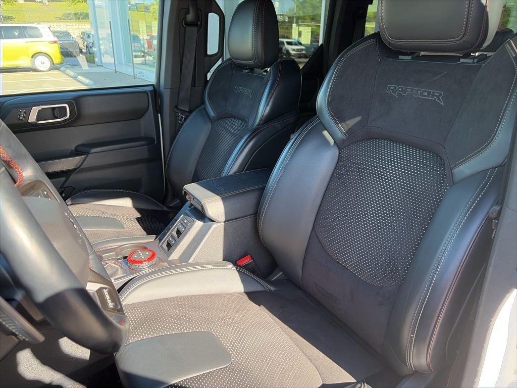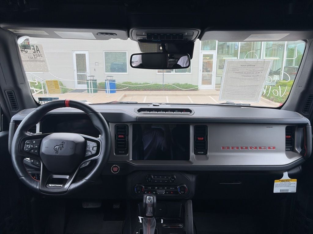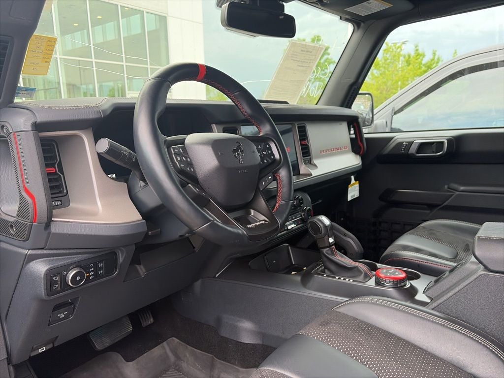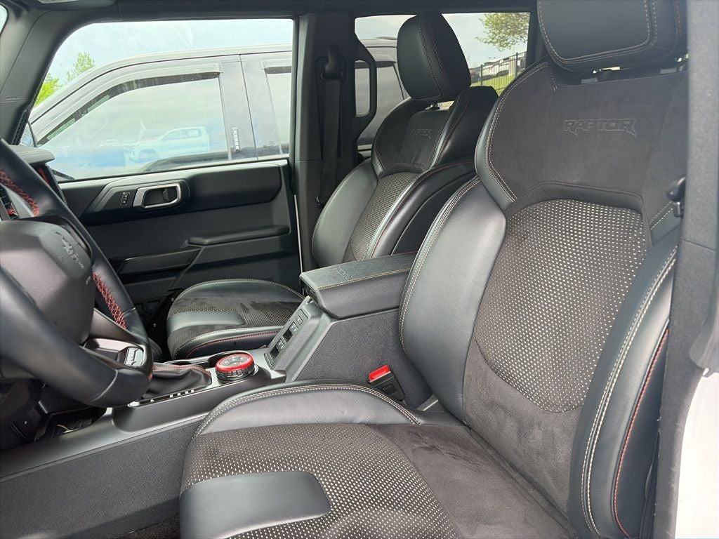 Bronco Raptor 17 BEADLOCK WHEELS, SUEDE SEATING, 4D Sport Utility, 3.0L EcoBoost V6, 10-Speed Automatic, 4WD, Oxford White, Black Onyx Leather, 10 Speakers, 4-Wheel Disc Brakes, 4.7 Axle Ratio, ABS brakes, Air Conditioning, Auto High-beam Headlights, Auto-dimming Rear-View mirror, Automatic temperature control, Brake assist, Compass, Connected Navigation, Convertible roof lining, Delay-off headlights, Driver door bin, Driver vanity mirror, Dual front impact airbags, Dual front side impact airbags, Electronic Stability Control, Emergency communication system: 911 Assist, Equipment Group 374A High/Lux Package, Exterior Parking Camera Rear, Front anti-roll bar, Front Bucket Seats, Front Center Armrest, Front dual zone A/C, Front fog lights, Front License Plate Bracket, Front reading lights, Front Row Top Panels & Door Storage Bags, Front wheel independent suspension, Fully automatic headlights, Garage door transmitter, Glass rear window, Heated door mirrors, Heated front seats, Heated steering wheel, Illuminated entry, Integrated roll-over protection, Leather Shift Knob, Low tire pressure warning, Marine Grade Vinyl Bucket Seats, Navigation system: Connected Navigation, Occupant sensing airbag, Outside temperature display, Overhead airbag, Overhead console, Panic alarm, Passenger door bin, Passenger vanity mirror, Power door mirrors, Power steering, Power windows, Radio: B&O Sound System by Bang & Olufsen, Rear anti-roll bar, Rear seat center armrest, Rear window defroster, Rear window wiper, Remote keyless entry, Security system, SiriusXM Radio w/360L, Speed control, Split folding rear seat, Steering wheel mounted audio controls, SYNC 4, Tachometer, Telescoping steering wheel, Tilt steering wheel, Traction control, Trip computer, Turn signal indicator mirrors, Variably intermittent wipers, Voltmeter, Wheels: 17 Dark Carbonized Gray Alloy Painted.